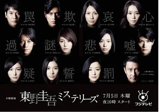 2012年播出的日剧《东野圭吾悬疑故事》(東野圭吾ミステリーズ)是一部由11个独立单元组成的悬疑剧集,每集都改编自日本推理大师东野圭吾的短篇小说。这部剧集结了日本影视界的豪华阵容,包括中井贵一、唐泽寿明、坂口宪二等实力派演员,每位都在不同的故事中担纲主演,展现出多变的演技魅力。