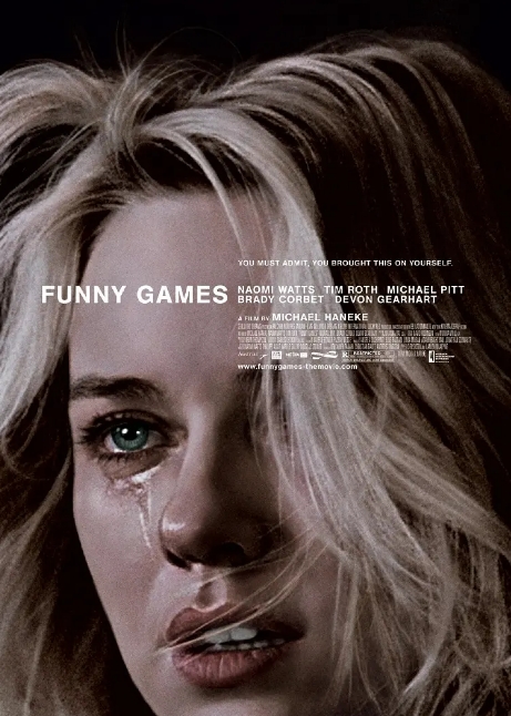 娜奥米·沃茨和蒂姆·罗斯饰演的夫妇带着儿子来到度假别墅,很快迎来两位西装革履的年轻访客。由迈克尔·皮特饰演的反派保罗挂着天使般的微笑,却用网球场线长度打赌这样的趣味游戏逐步摧毁这个家庭。值得注意的是,哈内克故意让反派直接面对镜头与观众对话,这种打破第四面墙的手法让观众从旁观者变成共谋者。