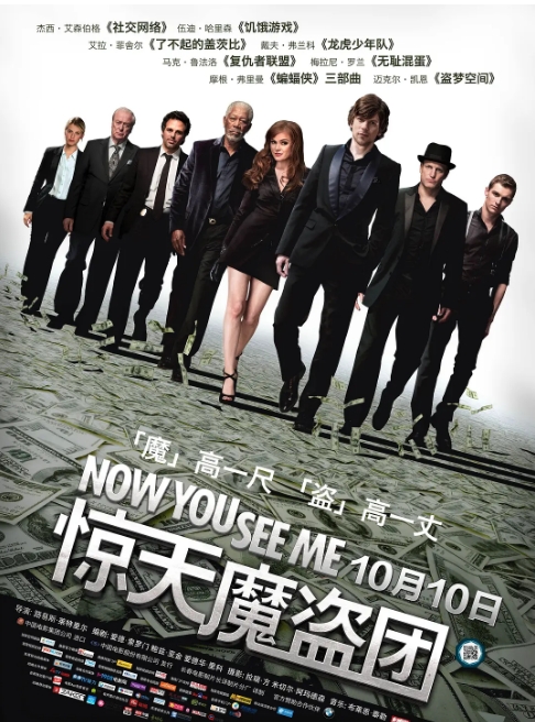 《惊天魔盗团》(Now You See Me)系列堪称新世纪魔术犯罪片的标杆之作。2013年首部曲以令人屏息的魔术劫案开场——四位街头魔术师被神秘力量集结成四骑士,在拉斯维加斯当着数千观众的面,完成了远程抢劫巴黎银行的惊天戏法。这个开场设定本身就充满戏剧张力:魔术师丹尼尔(杰西·艾森伯格饰)的扑克牌操控、催眠师梅里特(伍迪·哈里森饰)的心理暗示、逃脱专家亨莉(艾拉·菲舍尔饰)的水箱逃生,以及小偷杰克(戴夫·弗兰科饰)的敏捷身手,共同构成了一场视觉与智力的盛宴。