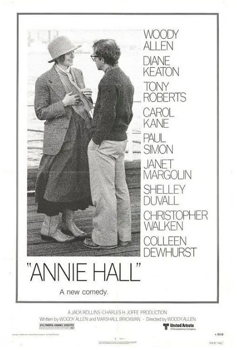 电影开篇便以阿尔维对着镜头自嘲的独白奠定基调:“人生分为可怕和可悲两种——可怕如终有一死、孤独宇宙,可悲如我居然穿这条皱巴巴的裤子。”这种打破第四面墙的手法,让观众瞬间被拉进一个既荒诞又真实的心理世界。片中安妮(黛安·基顿饰)首次亮相时穿着宽松马甲、男士领带和阔腿裤,这套由基顿本人私服改造的造型,不仅成为70年代时尚符号,更精准塑造出一个在迷茫中寻找自我的现代女性形象。