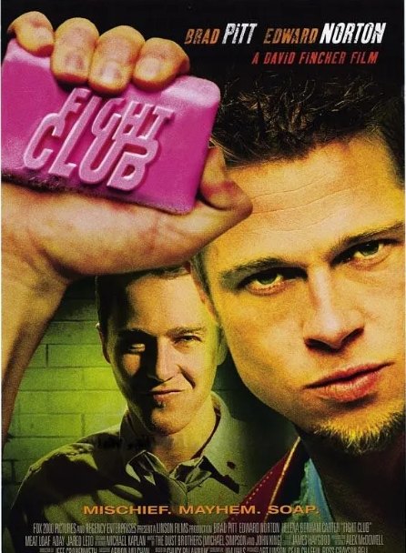 影片开场就用诺顿饰演的叙述者独白直指当代白领的生存状态:你所拥有的东西最终会反过来占有你。这个在汽车召回部门工作的中产阶级,住在宜家样板间般的公寓里,却饱受失眠困扰。直到他在飞机上遇见皮特饰演的泰勒——这个贩卖手工肥皂的狂野分子,两人在地下室创立了以肉体疼痛换取精神解脱的搏击俱乐部。