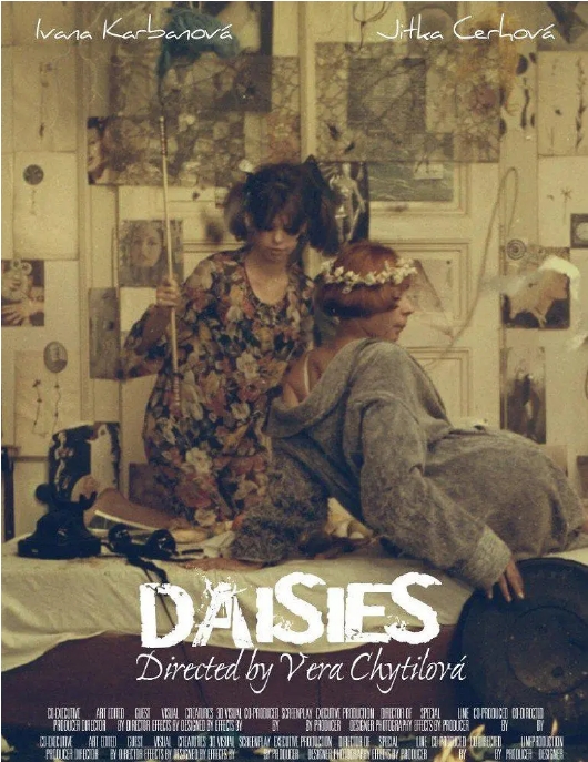 1966年诞生的捷克新浪潮代表作《雏菊》(Sedmikrásky)堪称影史一朵带刺的野花。导演维拉·希蒂洛娃用颠覆性的视听语言,讲述两个自称世界正在败坏,所以我们也该败坏的年轻女孩玛丽一世和玛丽二世的荒诞日常。这部被贴上荒诞喜剧标签的作品,实际是披着糖衣的社会批判——就像片中女孩们大快朵颐的盛宴,最终化作一场食物大战的狂欢。